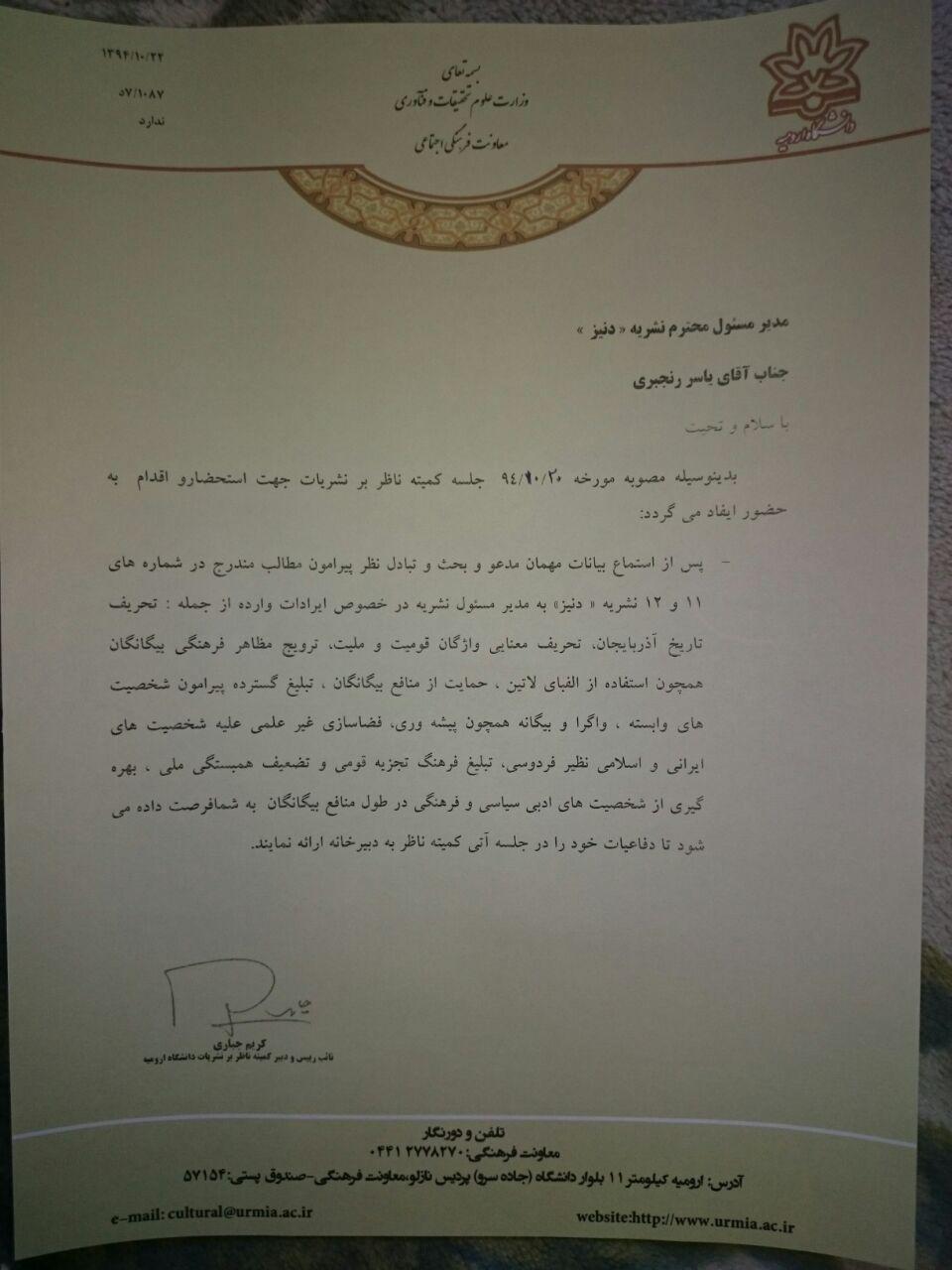 وی ادامه میدهد:«بررسی نشریه دنیز به جلسه دیگری موکول میشود و در این جلسه از یک زبانشناس دعوت به عمل آمده بود تا مطالب ترکی دو شماره اخر نشریه دنیز را بررسی کند. که با توجه به چاپ تصویر آتاتورک در جلد نشریه و برخی مطالب تورکی بعد از اتمام جلسه نامهای از این نشریه برایم ارسال شد که نشریه را با ذکر ایراداتی به مدت ۶ ماه به تعلیق درمیآورد.»