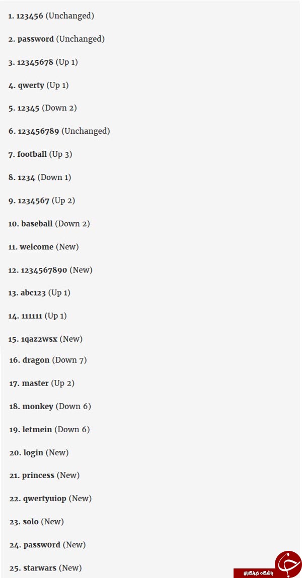 موسسه ''SplashData'' هر سال فهرستی از نامن ترین پسوردهای سال را منتشر می کند. این فهرست بر اساس رمز عبورهایی که در طول سال هک شده و به دست افراد سودجود افتاده اند ایجاد شده و نشان می دهد که چه رمزهایی به راحتی هک می شوند.