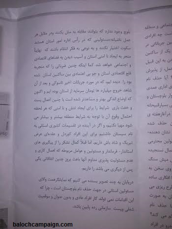 در این بروشورها آمده است: "آیا حذف نام بلوچستان در دفترچه های درمانی و سربرگ های اداری عمدی نبود ؟ و به دنبال آن مخدوش کردن تابلو های بلوار بلوچستان و به دنبال آن حذف کلی تابلوها از بلوار مذکور عملی بسیار قبیحانه و غیر قابل چشم پوشی به شمار نمی آید؟ و در پایان و در هفته وحدت نصب بنر های که در آن نام بلوچستان حذف شده بود غیر قابل اغماض است"