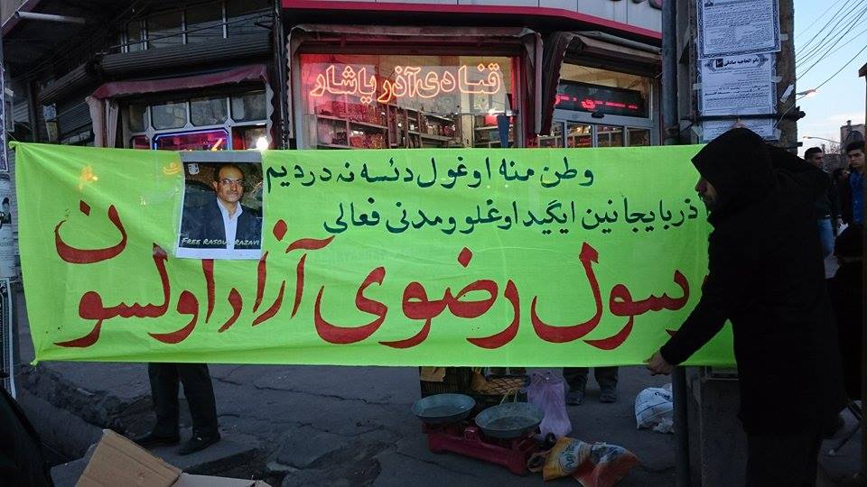 فعالین مدنی آزربایجان با نصب پارچه نوشته ای خواستار آزادی رسول رضوی، فعال مدنی محبوس آزربایجانی از زندان شدند.