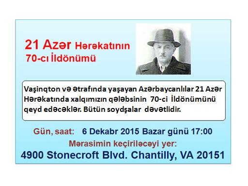 از واشنگتن گزارش می شود فعالین حرکت ملی ساکن آن شهر و اطراف روز یکشنبه هفته آتی مصادف با ششم دسامبر به مناسبت هفتادمین سالگرد حکومت ملی آزربایجان مراسمی برگزار خواهند کرد.