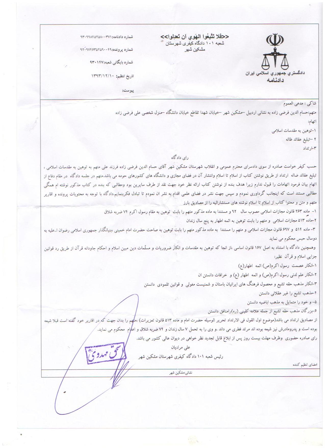 حسام الدین فرضی زاده نویسنده مشکین شهری، طبق حکم صادره از سوی شعبه ۱۰۱ دادگاه کیفری مشکین شهر، به اتهام «توهین به مقدسات اسلامی»، «تبلیغ عقاید ضاله» و «ارتداد» در اسفندماه سال ۹۳ به ۷سال زندان، ۷۴ ضربه شلاق و اعدام محکوم شد.