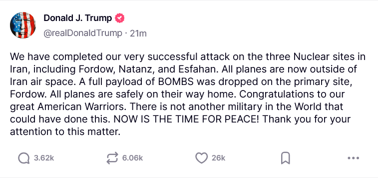 دونالد ترامپ، رئیسجمهور آمریکا، در پستی در شبکه اجتماعی تروث اعلام کرد که حملهای بسیار موفقیتآمیز علیه سه سایت هستهای ایران انجام شده است.