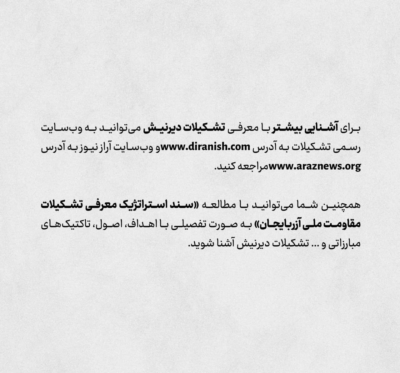 برای آشنایی بیشتر با معرفی تشکیلات مقاومت ملی آزربایجان (دیرنیش) میتوانید به وبسایت رسمی تشکیلات و وبسایت آراز نیوز مراجعه کنید.