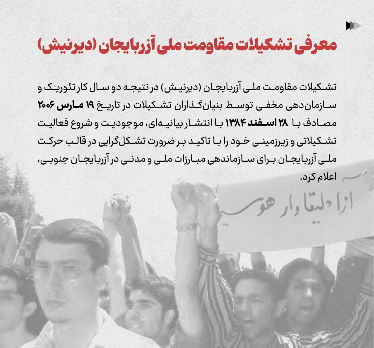 تشکیلات مقاومت ملی آزربایجان (دیرنیش) در نتیجه دو سال کار تئوریک و سازماندهی مخفی توسط بنیانگذاران تشکیلات در تاریخ ۱۹ مارس ۲۰۰۶ مصادف با ۱۳۸۴/۱۲/۲۸ با انتشار بیانیهای، موجودیت و شروع فعالیت تشکیلاتی و زیرزمینی خود را با تاکید بر ضرورت تشکلگرایی در قالب حرکت ملی آزربایجان برای سازماندهی مبارزات ملی و مدنی در آزربایجان جنوبی، اعلام کرد.