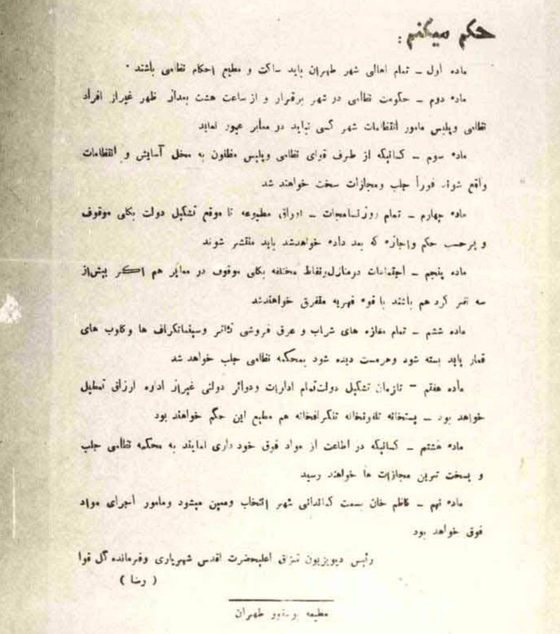 حدود یک قرن پیش در چنین روزی مردم تهران با اعلامیههایی روبرو شدند که با امضای «رضا» و تیتر «حکم میکنم» به مردم عادی کوچه و خیابان دستور داده بود که مطیع شوند.