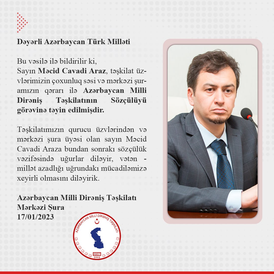 به گزارش آراز نیوز به نقل از سایت رسمی تشکیلات دیرنیش، شورای مرکزی در اطلاعیه ای به طور رسمی آقای مجید جوادی آراز را به عنوان سخنگوی تشکیلات مقاومت ملی آزربایجان تعیین کرد.