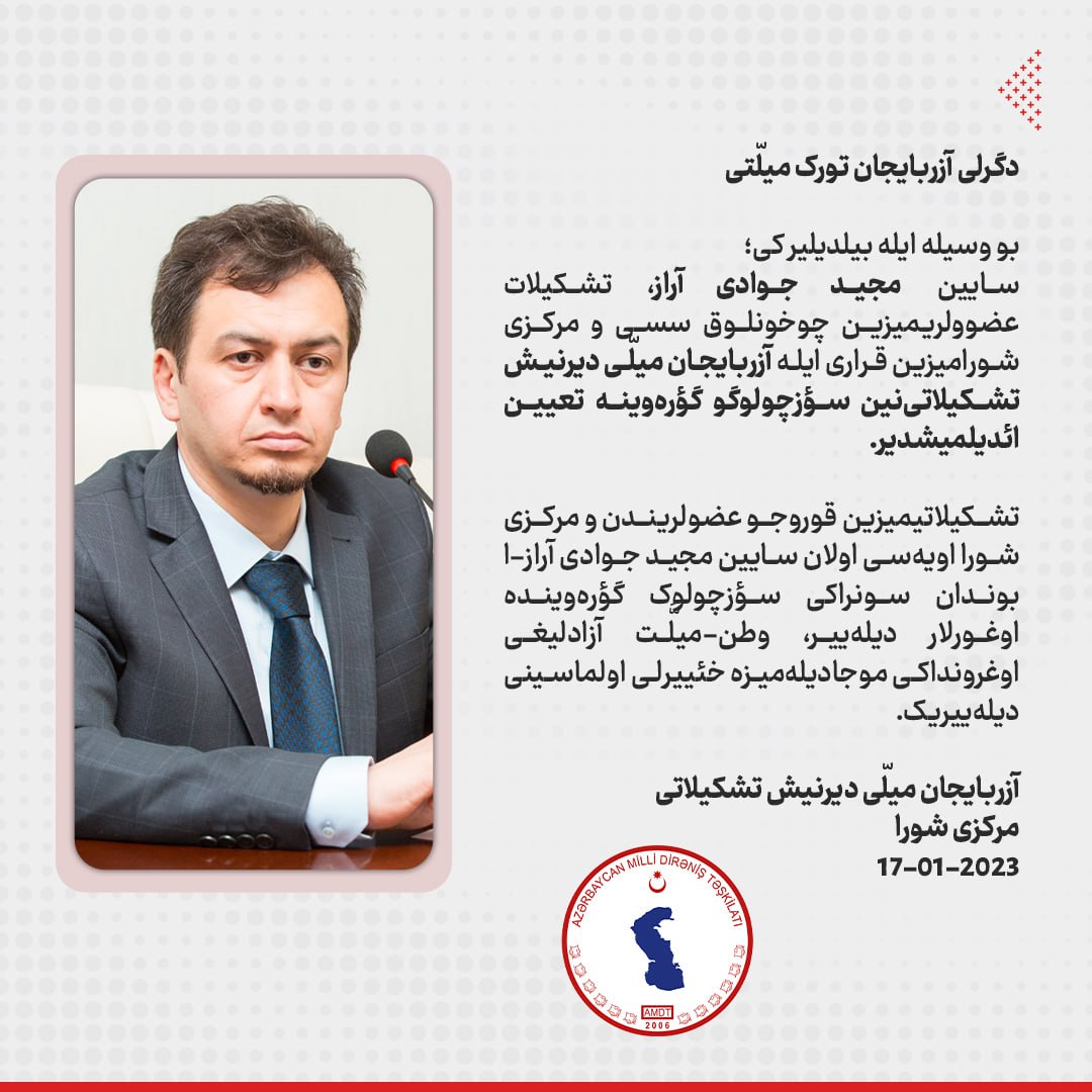 آقای مجید جوادی آراز به عنوان سخنگوی تشکیلات مقاومت ملی آزربایجان تعیین شد
