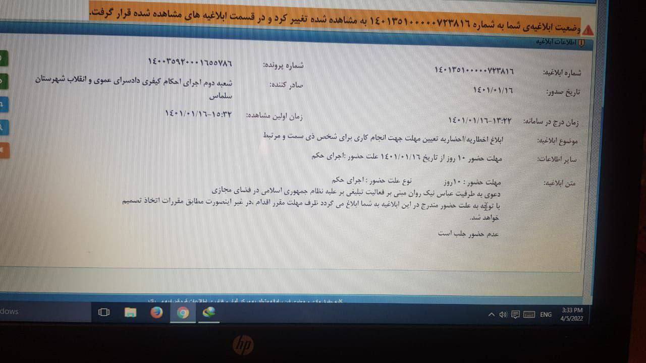 عباس نیکروان موزیسین و فعال ملی مدنی آزربایجانی ساکن شهرستان سلماس آزربایجان غربی امروز شنبه ۱۷ اردیبشهت ماه ۱۴۰۱ توسط ضابطین قضایی بازداشت و جهت اجرای حکم روانه زندان سلماس گردید.