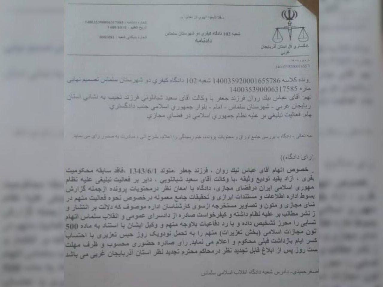 این فعال آزربایجانی توسط شعبه ۱۰۲ دادگاه کیفری دو شهرستان سلماس استان آزربایجان غربی با استناد به ماده ۵۰۰ قانون مجازات اسلامی به ۹۱ روز حبس تعزیری به اتهام فعالیت تبلیغی علیه نظام جمهوری اسلامی ایران در فضای مجازی محکوم شده است.