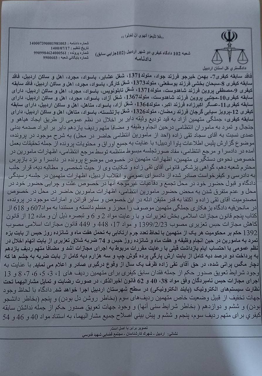 شعبه ۱۰۲ دادگاه کیفری ۲ شهر اردبیل با تصدی طاهر رسولی طی حکمی که از طریق سامانه ثنا دیروز ۱۷ مهر ۱۴۰۰ ابلاغ نموده، هر یک از فعالین ملی و مدنی بازداشت شده در پارک جیرال اردبیل در حمایت از آزادسازی قاراباغ به اسامی «پرویز سیابی»، «حسین بالاخانی»، «عسگر اکبرزاده»، «مصطفی پروین»، «مرتضی پروین»، «مجتبی پروین»، «حامد حیدری»، «محمد جولانی»، «سبحان بخشی»، «مهدی هوشمند»، «بهمن خیرجو» و «سجاد جولانی» را با لحاظ مقررات تعدد جرم از بابت اتهام تمرد نسبت به مأمورین انتظامی حین انجام وظیفه با استناد به ماده ۶۰۷ کتاب پنجم قانون مجازات اسلامی -مبحث تعزیرات به تحمل ۷ ماه و ۱۶ روز حبس تعزیری و از بابت اتهام مشارکت در اخلال در نظم عمومی از طریق ایجاد هیاهو و جنجال با استناد به ماده ۶۱۸ همان قانون به تحمل ۷ ماه و ۱۶ روز حبس تعزیری و ۷۴ ضربه شلاق تعزیری مبادرت به صدور رأی محکومیت کرده است.