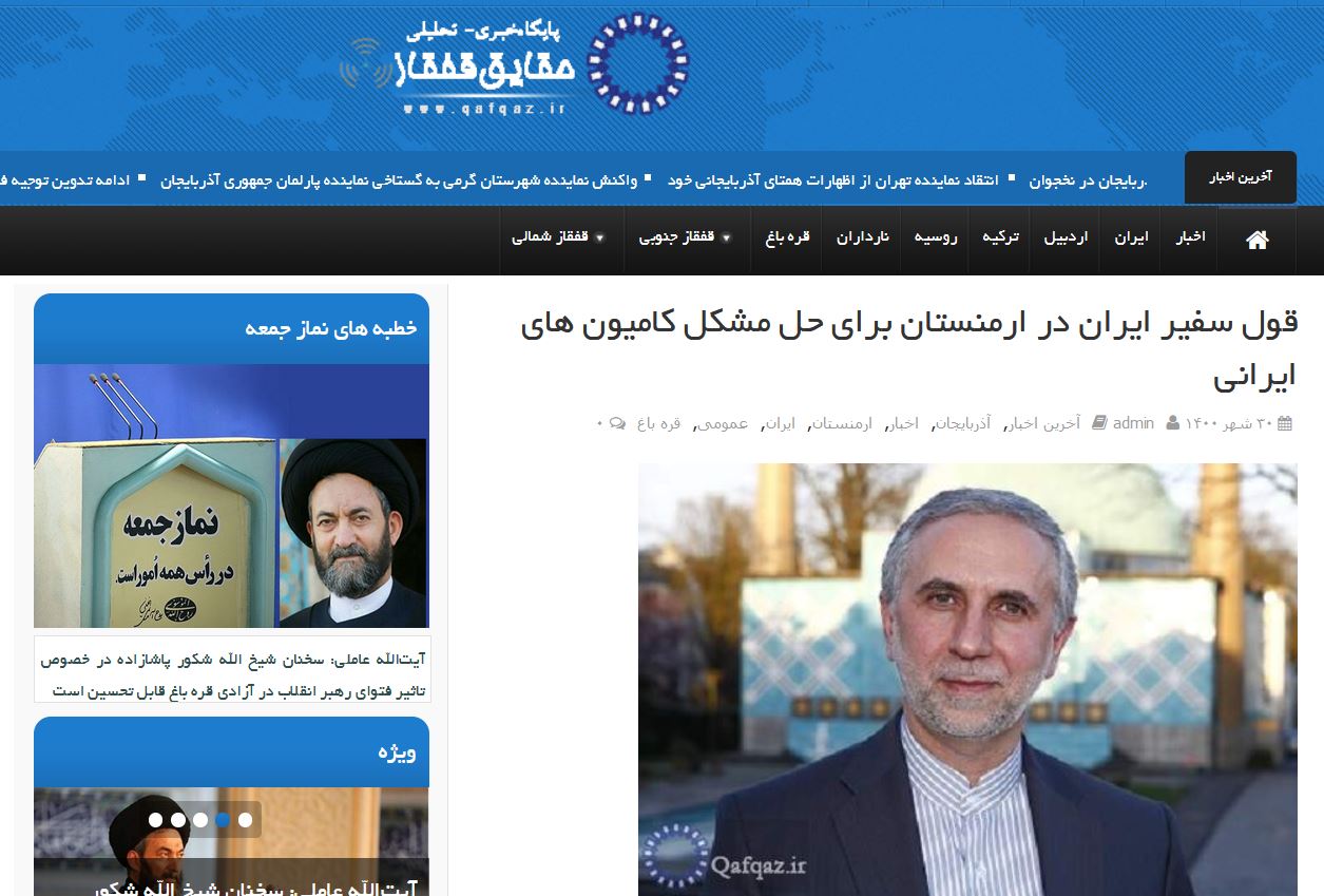یکی از قابل توجهترین مطالب در رسانههای ایرانی، گزارشی در وب سایت Qafqaz. ir با عنوان «وعده سفیر ایران در ایروان برای حل مشکلات رانندگان ایرانی» است. این سایت وابسته به حسن عاملی نماینده علی خامنهای در اردبیل است. حسن عاملی چند روز پیش آزربایجان را با ادبیات تحقیرآمیزی تهدید کرده بود. این سایت از جمله رسانههایی است که با سرمایه کشور ایران توسط جمهوری اسلامی راه اندازی شده و به انتشار اخبار ضد آزربایجانی معروف است و مدعی است «در آزربایجان به شیعیان ظلم میشود».