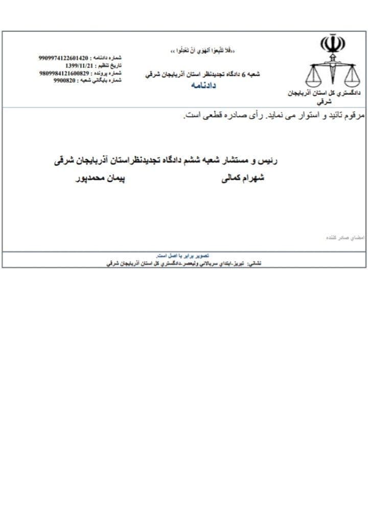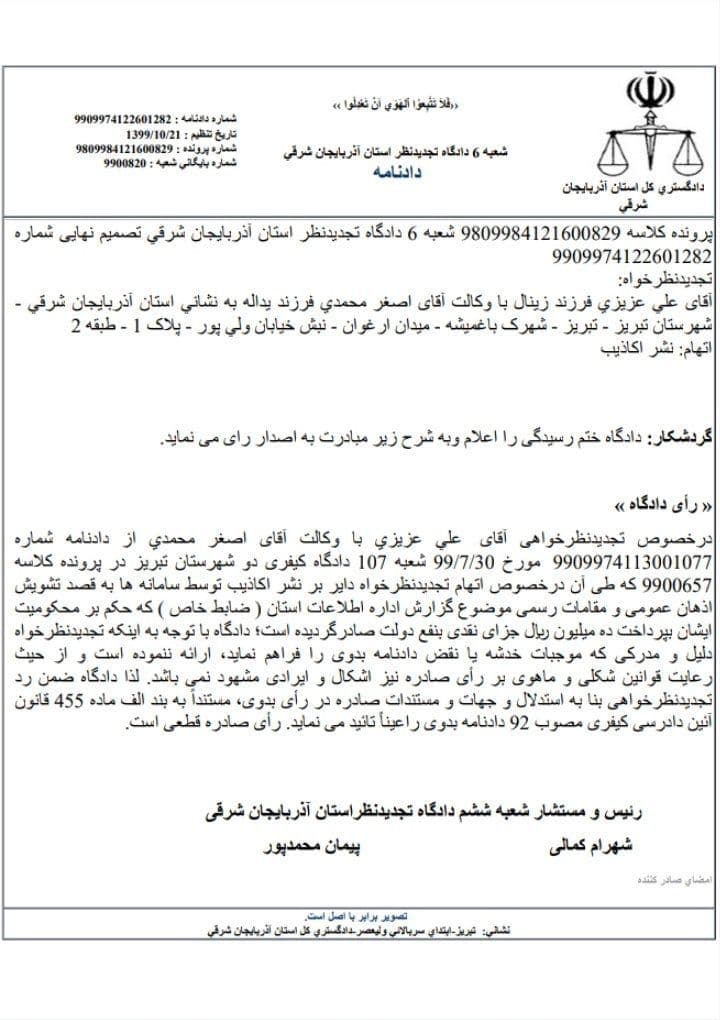 این فعال آذربایجانی در بخش دوم پرونده در خصوص اتهام '' نشر اکاذیب توسط سامانه ها به قصد تشویق اذهان عمومی و مقامات رسمی'' در شعبه ۶ دادگاه تجدیدنظر مستندا به بند الف ماده ۴۵۵ قانون آئین دادرسی کیفری مصوب ۹۲ حکم بر محکومیت ۱۰ میلیون ریال جزای نقدی بنفع دولت تایید گردید.