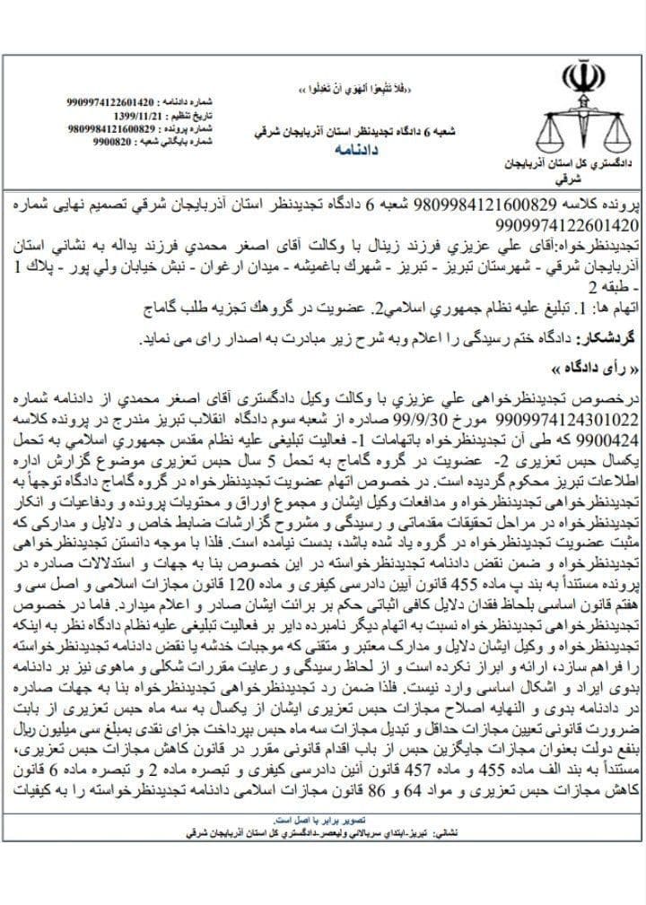 علی عزیزی فعال ملی مدنی آذربایجانی ساکن اورمیه توسط شعبه ۶ دادگاه تجدید نظر استان آذربایجان شرقی در بخش نخست و دوم پرونده مجموعا به ۴ میلیون تومان جزای نقدی محکوم شد.