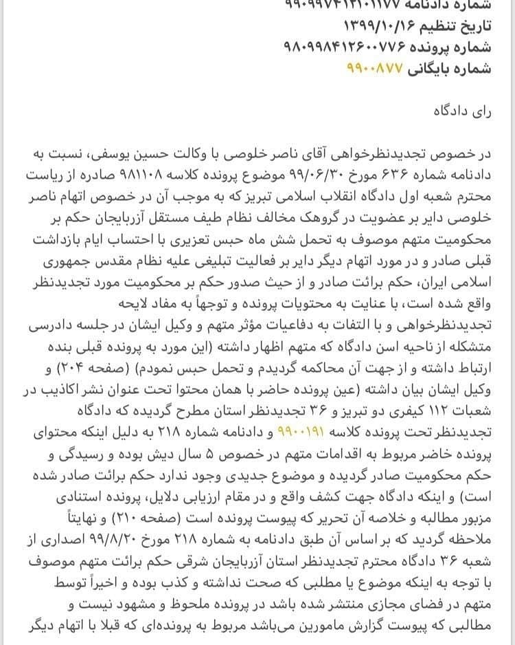 ناصر خلوصی ، فعال ملی آزربایجان ساکن شهر تبریز، توسط دفاتر ۱ و ۳۶ دادگاه تجدیدنظر تبریز تبرئه شد.