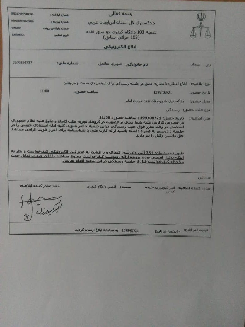 «سجاد شهیری» فعال ملی مدنی آزربایجانی ساکن سولدوز (نقده) طی ابلاغیه ای که از طریق سامانه الکترونیکی قوه قضاییه دریافت کرده، مقرر گردیده است ساعت ۱۱:۰۰ روز ۲۱ آبان ماه ۹۹ در شعبه ۱۰۳ دادگاه کیفری دو شهر سولدوز (نقده) حاضر گردد.