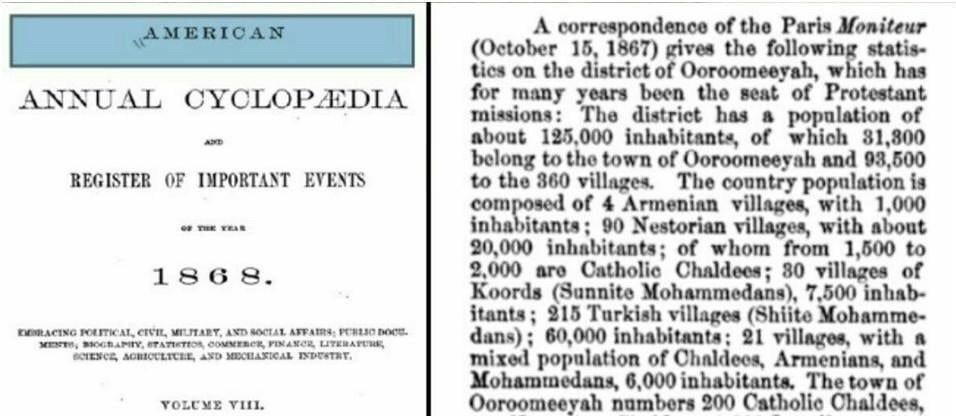 به نقل از مونیتور (Moniteur) چاپ پاریس فرانسه در اکتبر سال ۱۸۶۷ آماری درباره ترکیب جمعیتی قومی و دینی شهر و ناحیه اورمیه داده شده است. همانگونه که معلوم است میسیونرهای مسیحی و هئیت های سیاسی اروپائی در دوره مذکور، حضور بسیار موثر و فعالی در غرب آذربایجان داشتند و به ویژه علاقهمند به تبیین ترکیب جمعیتی – ملی و تغییر و مهندسی آن به نفع گروههای مسیحی و علیه تورکهای مسلمان بودند. با این وصف میتوان گفت که احتمال بزرگنمائی شمار تورکها در این آمار وجود ندارد و در نتیجه آمار مذکور تصویر قابل قبولی از ترکیب جمعیتی – ائتنیکی اورمیه و پیرامون آن در سالهای مذکور را بدست میدهد. با بررسی این آمار معلوم میشود که در دوره مورد بحث تورکها نزدیک به ٩٢ درصد جمعیت شهر اورمیه و ۶۵ درصد پیرامون آن را تشکیل میدادهاند.