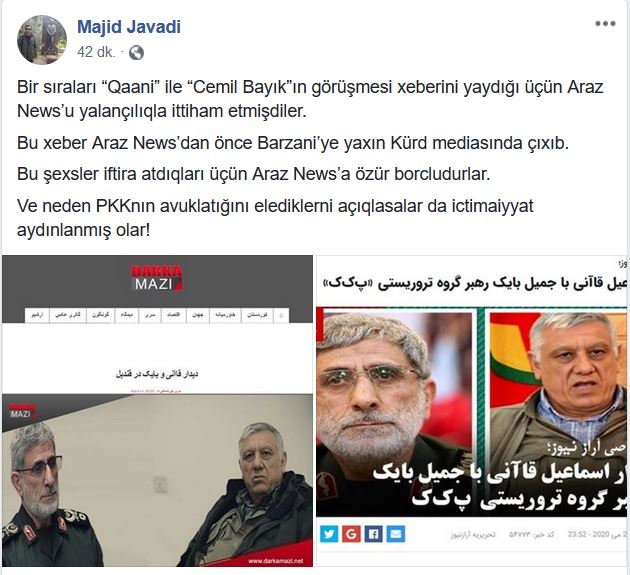 مجید جوادی عضو شورای مرکزی تشکیلات مقاومت ملی آزربایجان، با انتشار تصاویر خبر دیدار رهبر گروه تروریستی پ.ک.ک با سردار اسماعیل قاآنی فرمانده نیروی سپاه قدرس جمهوری اسلامی ایران به برخی شائبه ها در صفحه فیسبوک خود پاسخ داد.