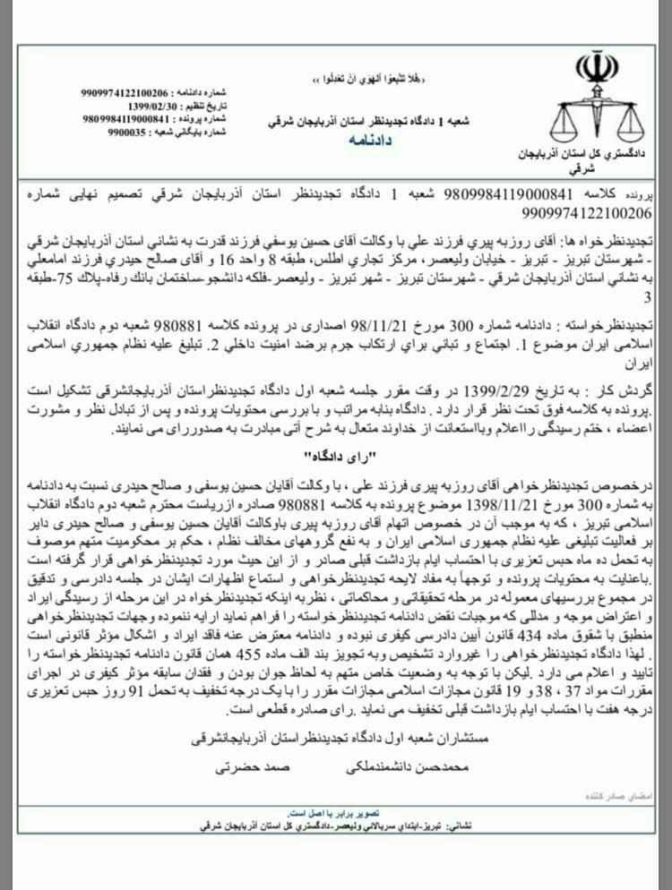 روزبه پیری فعال ملی مدنی آزربایجانی و از بازداشت شدگان اعتراضات آبان ماه ۹۸ در شهر تبریز، توسط شعبه اول دادگاه تجدیدنظر استان آزربایجان شرقی با مستشاری آقایان محمدحسین دانشمند ملکی و صمد حضرتی به ۹۱ روز حبس تعزیری محکوم گردید.