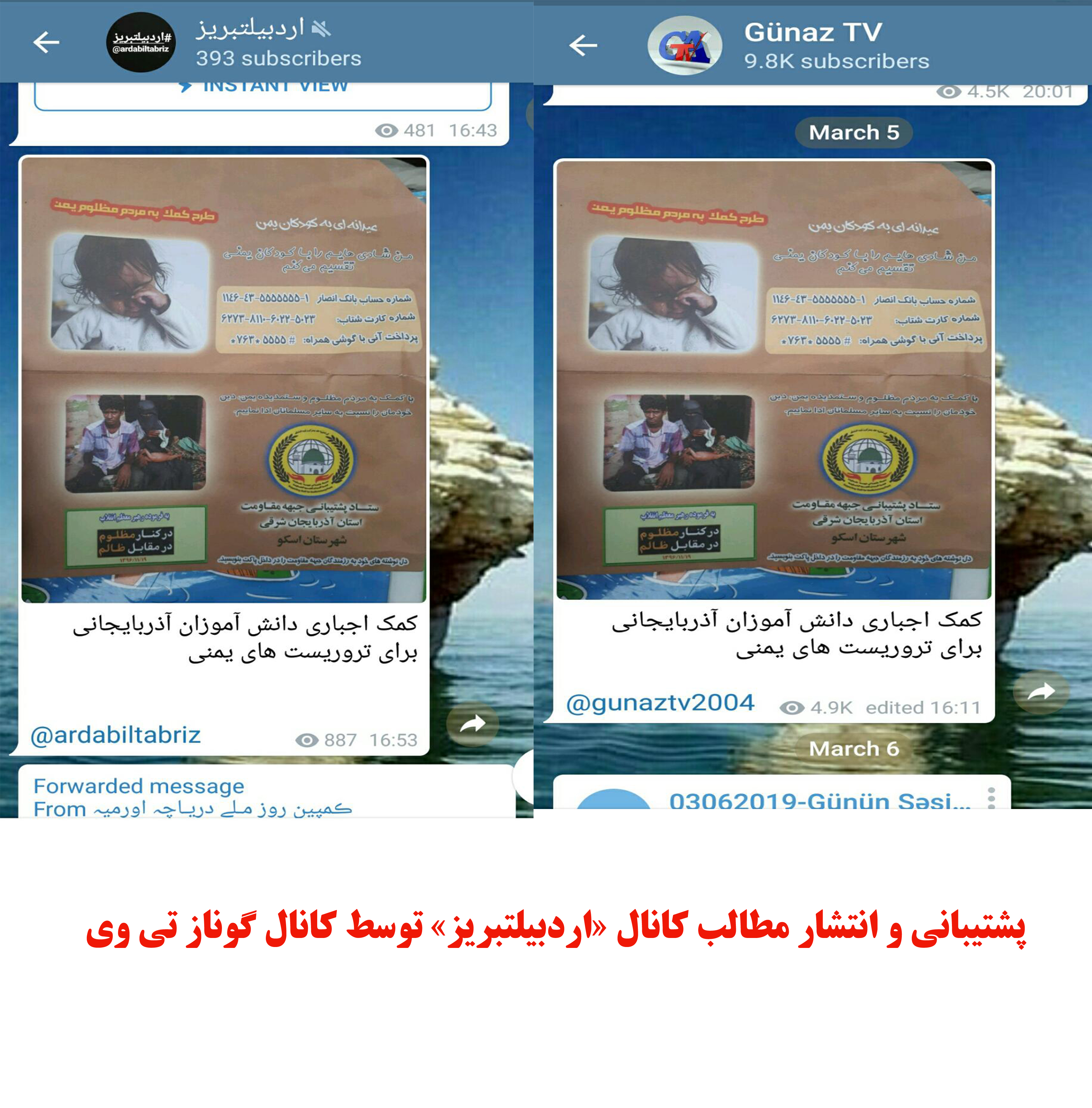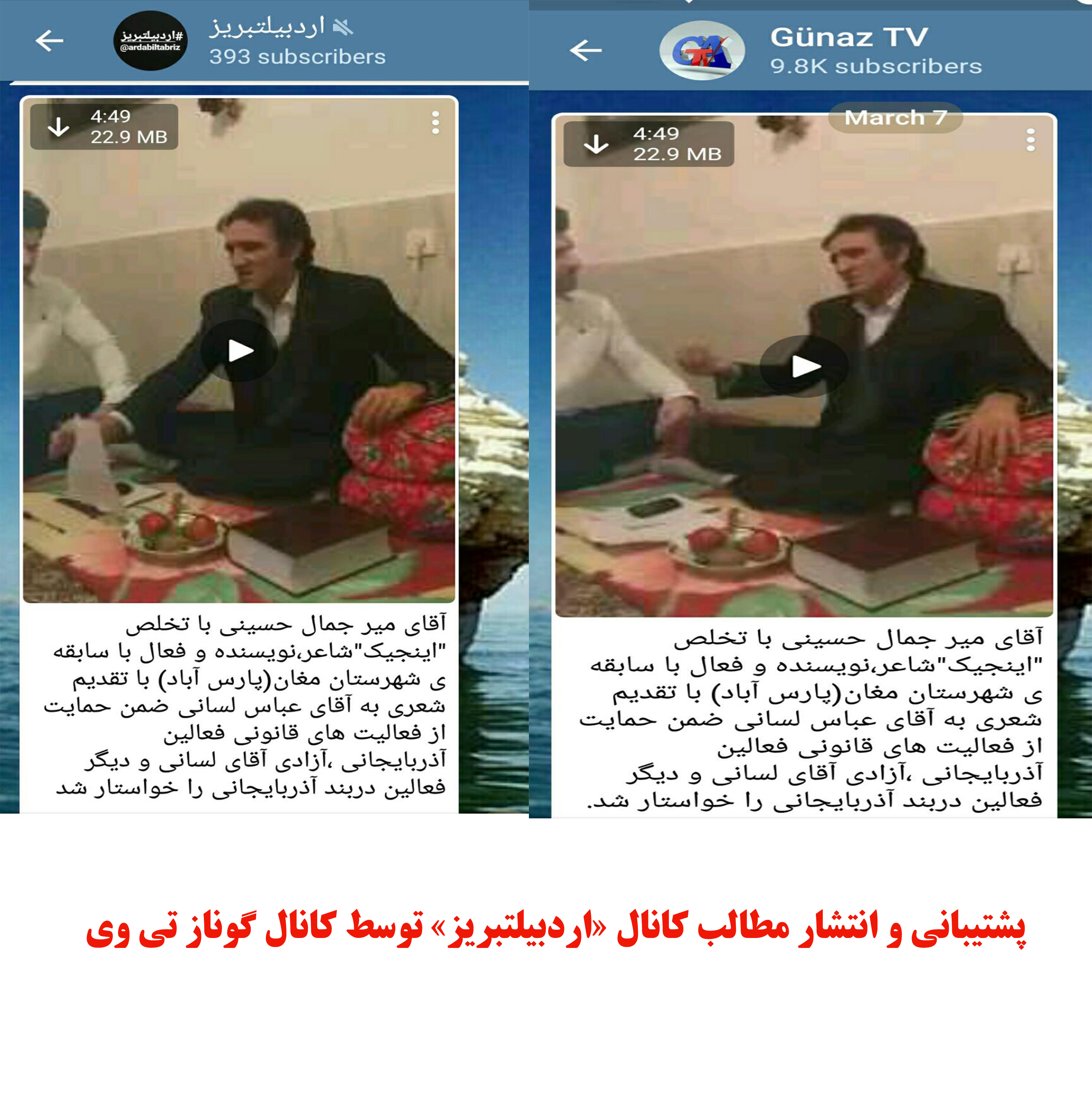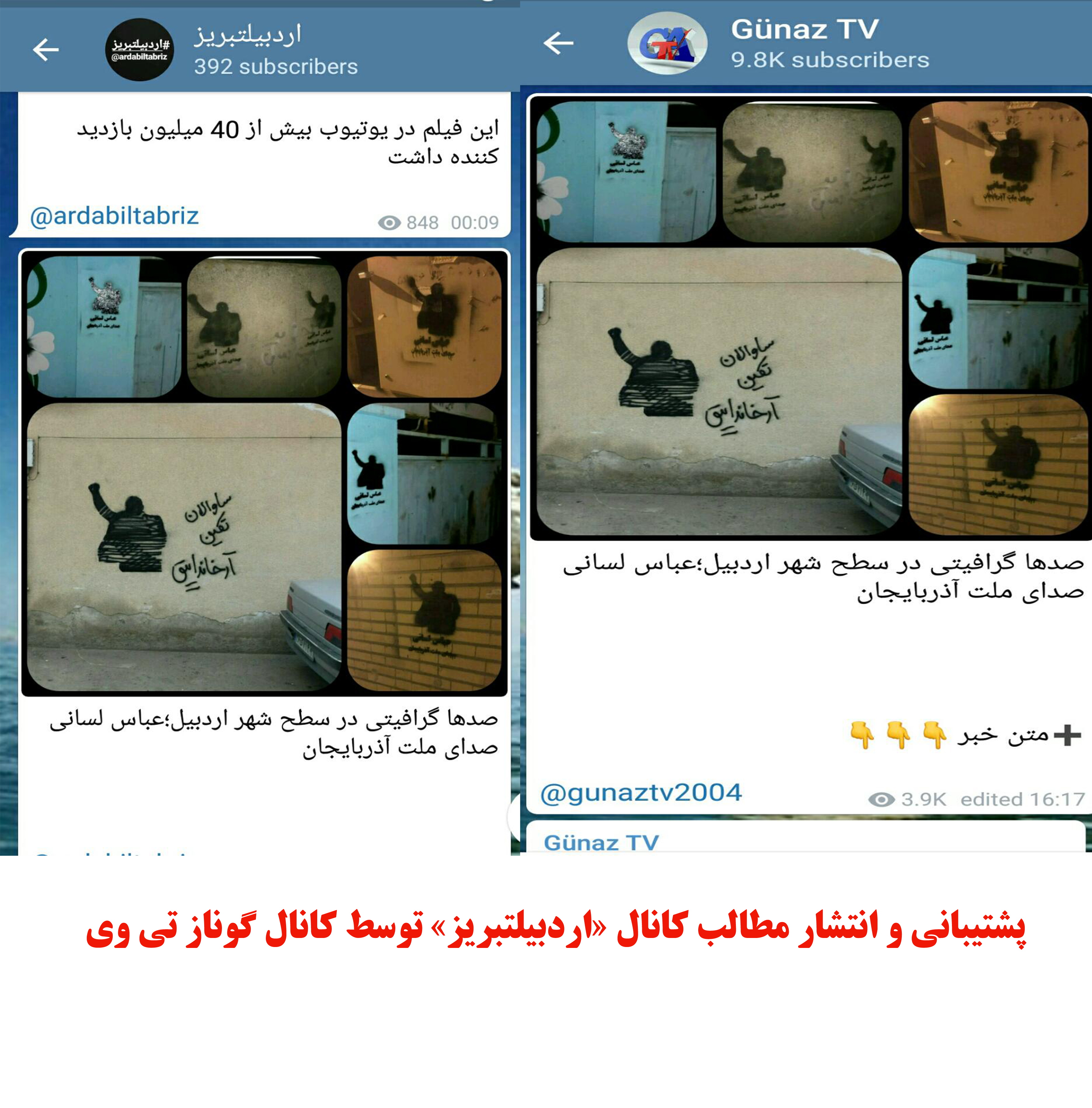 ۳- نکته سوم، کانال تلگرامی «گوناذ تی وی» و کانال تلگرامی «اردبیل تبریز» و سه کانال تلگرام که لینکهای یکدیگر را پشتیبانی میکنند، بهصورت همزمان، در یک ساعت معین و با فرمتهای یکسان خبری موضوع بازداشت جناب عباس لسانی را بهصورت انحصاری پوشش میدهند (چنانکه در تصاویر نیز مشاهده میشود پستهای خبری «گوناذ تی وی» و «اردبیل تبریز» عیناً و تنها بافاصله چند دقیقه آپلود شده است) وبسایت آرازنیوز نیز بعد از دریافت فایل صوتی و انعکاس آن در کانالهای زیرمجموعه «گوناذ تی وی» اقدام به انتشار این فایل صوتی نمود شایانذکر است اگر برخی مدعی این موضوعات را رد میکنند، فایلهای فوروارد شده از کانال «اردبیل تبریز» (یکی از کانالهای پنجگانه مورد تائید گوناذ تی وی که لینکهای پشتیبانیاش را تبلیغ میکند) همانطور که در تصویر دیده میشود کماکان در گروههای تلگرامی قابلدسترسی میباشد.