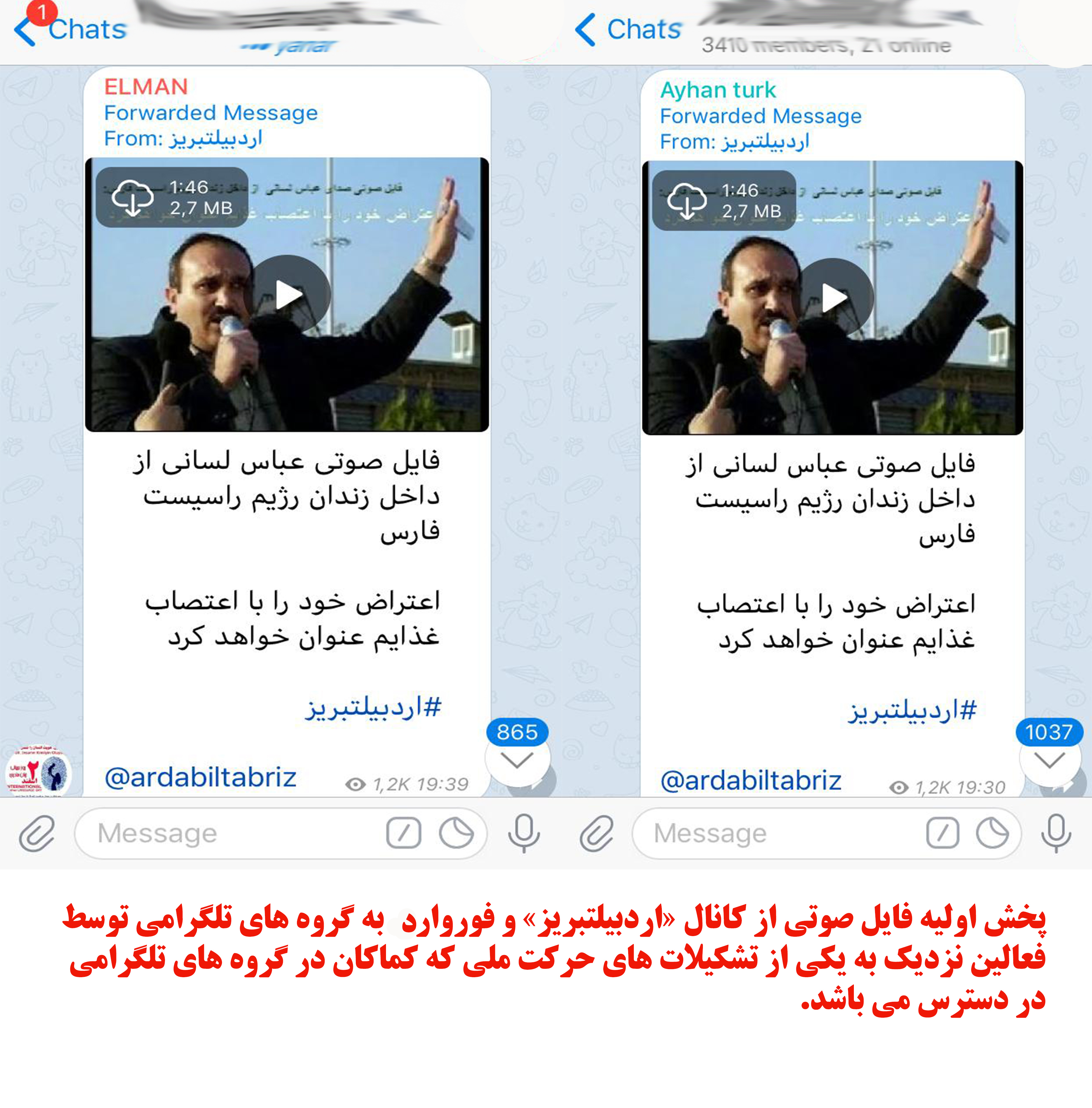 ۲-نکته دوم نحوه انتشار اولیه فایل صوتی منتسب به جناب عباس لسانی میباشد، این فایل برای نخستین بار در پنج کانال تلگرامی که اخبار بازداشت جناب عباس لسانی بهصورت انحصاری پوشش میدهند، منعکس و توسط ادمین کانال تلگرامی «اردبیل تبریز» و توسط افرادی منتسب به یکی از تشکیلاتهای حرکت ملی به شکل گسترده در گروههای تلگرامی فوروارد و به ادمین کانال تلگرامی آرازنیوز نیز ارسال گردید. در تصاویر ذیل پخش ویدئو پیام جناب عباس لسانی توسط کانال «اردبیل تبریز» در گروههای تلگرامی مشهود میباشد.