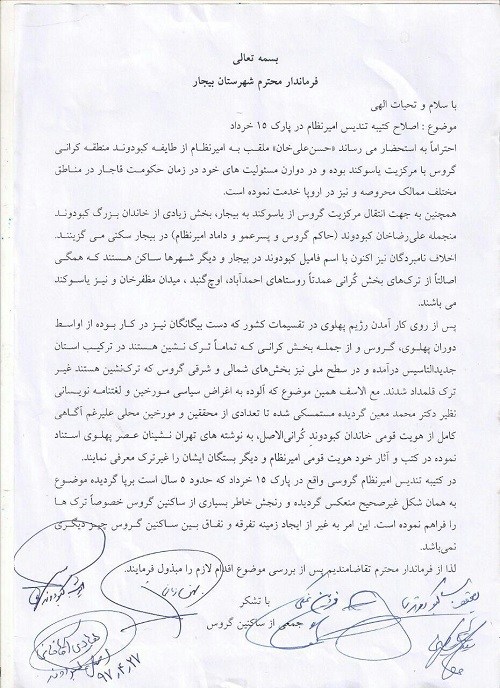 مردم شهرستان بیجار طی نامهای به فرماندار این شهرستان به تحریف هویت تورکی امیر نظام گروسی در کتیبه تندیس در یکی از پارکهای این شهر اعتراض کردند.