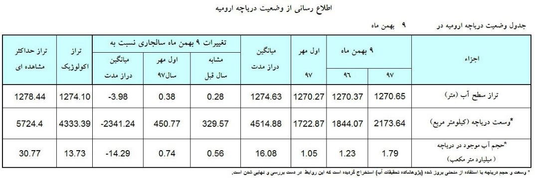 گفتنی است حجم آب موجود در دریاچه اورمیه در تاریخ ۹ بهمن ماه سال جاری رقم ۱.۷۹ میلیارد متر مکعب بوده که نسبت به مدت مشابه سال گذشته با رشد ۰.۵۶ میلیارد متر مکعبی و نسبت به دراز مدت با کاهش ۱۴.۲۹ میلیارد متر مکعبی همراه بوده است.