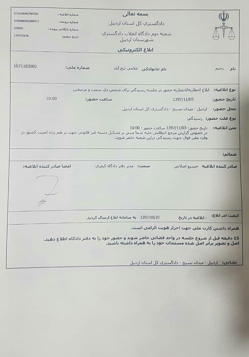 بنابه اطلاع آرازنیوز؛ رحیم غلامی فعال حرکت ملی آزربایجان روز پنجشنبه ۲۰ دی ماه ۱۳۹۷ طی ابلاغیهای به شعبه دوم دادگاه انقلاب اردبیل احضار شده است.