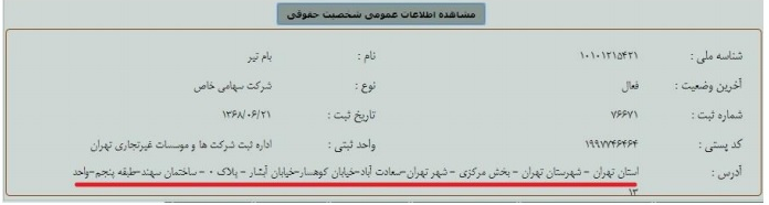 «شرکت بام تیر» (سهامی خاص) این شرکت در تاریخ ۶۸/۶/۲۱ تأسیس و محل اقامت قانونی آن نیز دقیقاً همان محل اقامت «شرکت فرآوران دشت سبز سبلان» است و آقای «میرطاهر موسوی» رئیس هیات مدیره و یکی از سه سهامدار اصلی آن میباشد.
