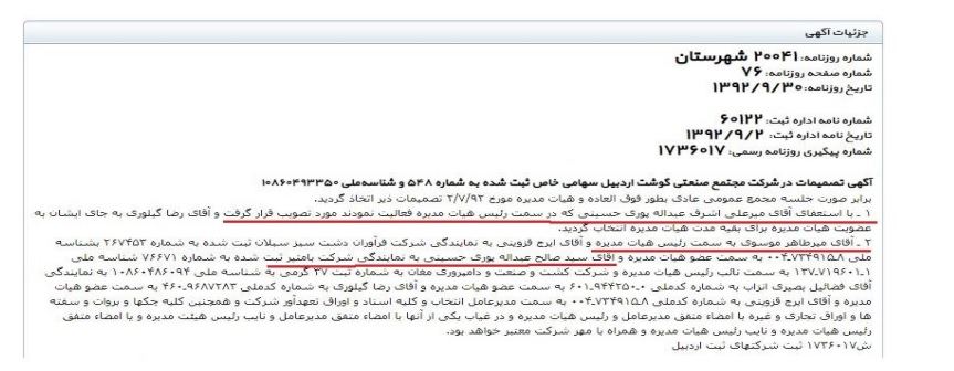 لاجرم وی از ریاست هیات مدیره شرکتهای «فراوران دشت سبز سبلان» و «مجتمع گوشت اردبیل» استعفا داده و جای خود را به «میرطاهر موسوی» داد.