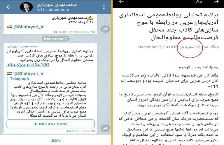 ساعت ۱۵:۵۵ روز جمعه کانال تلگرامی رسمی محمد مهدی شهریاری پستی را منتشر کرد که در آن خبر از انتشار بیانیه روابط عمومی استانداری منتشر شده بود. این پست حاوی لینکی برای دسترسی به متن بیانیه بود. با کلیک بر روی لینک مذکور به یک کانال خبری کردی که به انتشار اخبار گروه تروریستی پکک میپردازد وارد می شویم. اما ماجرا زمانی جالبتر میشود که ساعات انتشار این بیانیه را در وب سایت استانداری و این کانال حامی تروریسم بررسی می کنیم. این بیانیه راس ساعت ۱۵:۲۹ در صفحه استانداری منتشر شده است، لیکن در حالی که می بایست این کانال خبری حامی تروریسم خبر را بعد از آن منتشر میکرد ولی مشاهده میشود که کانال مذکور پست را ساعت ۱۵:۱۷ دقیقه منتشر کرده است. یعنی ۱۲ دقیقه قبل از انتشار آن در وب سایت استانداری! حال سوالی که پیش می آید این است که اگر همکاری و ارتباط پشت پردهای میان استاندار غیر بومی و حامیان تروریسم و وابستگان آن وجود ندارد چگونه این بیانیه قبل از انتشار به دست آنها رسیده است؟