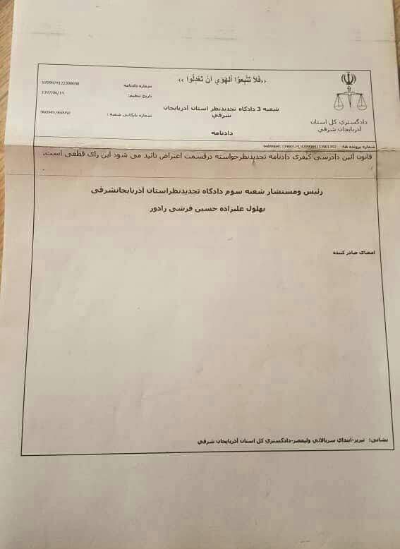 دادگاه تجدید نظر استان آزربایجان شرقی، حکم بدوی ۶ تن از فعالین ملی آزربایجان را عینا تائید کرد.