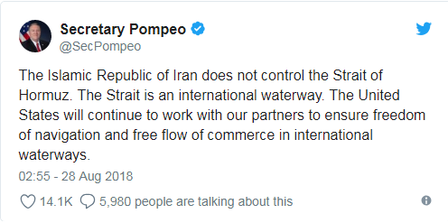 مایک پومپئو وزیر امور خارجه آمریکا شامگاه دوشنبه ۵مرداد، با انتشار توئیتی نوشت که تنگه هرمز، تحت نظارت قوانین دریانوردی بینالمللی قرار دارد و ایران بر خلاف ادعایش، آن را کنترل نمیکند. او این توئیت تاکید کرد: "تنگه هرمز آب راهی بینالمللی است".