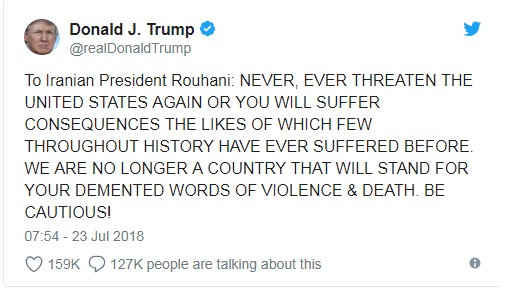 پرزیدنت دونالد ترامپ که توئیت خود را تماماً با حروف بزرگ و به نشانه تأکید نوشته بود، خطاب به روحانی گفت ما دیگر آن کشوری نیستیم که حرفهای جنونآمیز شما از خشونت و مرگ را تحملکنیم. مواظب باش.