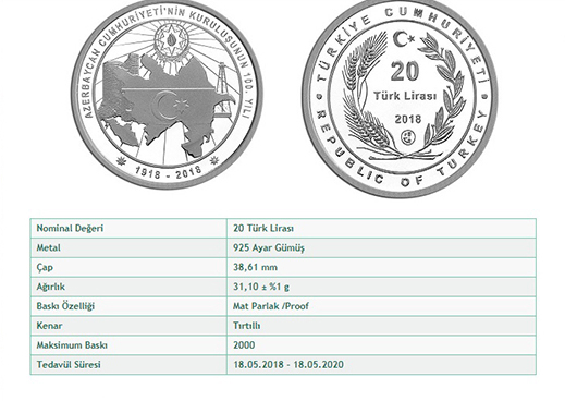 به مناسبت صدمین سالگرد استقلال آزربایجان شمالی در ترکیه سکه ۲۰ لیرهای از جنس نقره ضرب شد.