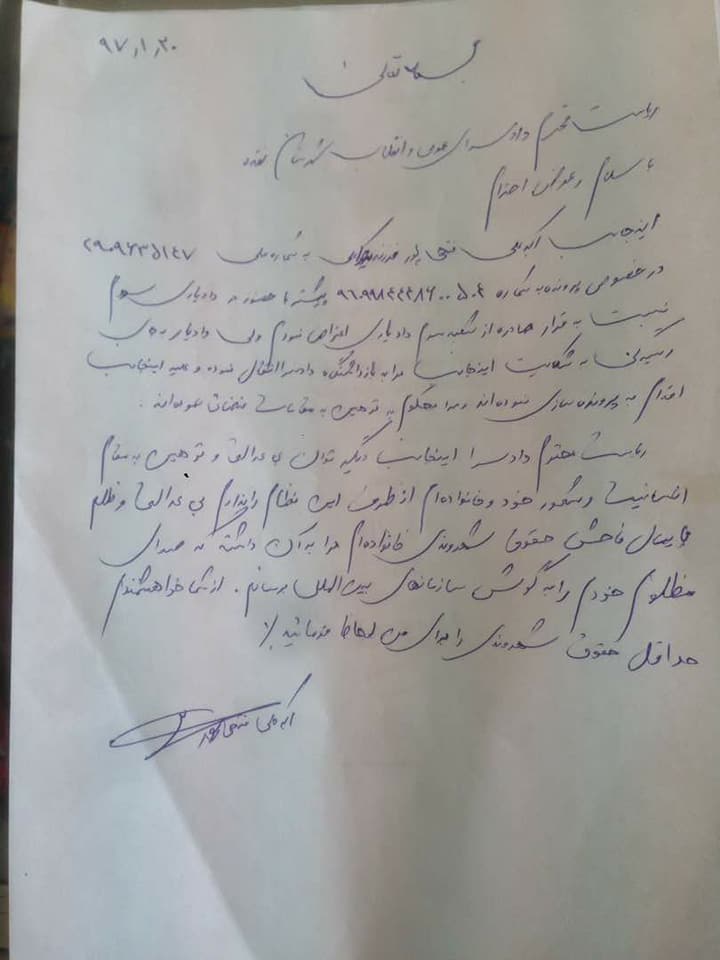 در این نامه اکبرعلی فتحی پور(پدر شهید فتحیپور) خطاب به دادستان سولدوز نوشته است به دلیل پروندهسازیهای بیجا توهین و سلب حقوق شهروندیاش از اعاده حقوق خویش ناامید شده و چارهای جز مراجعه به نهادهای حقوق بشری ندارد.