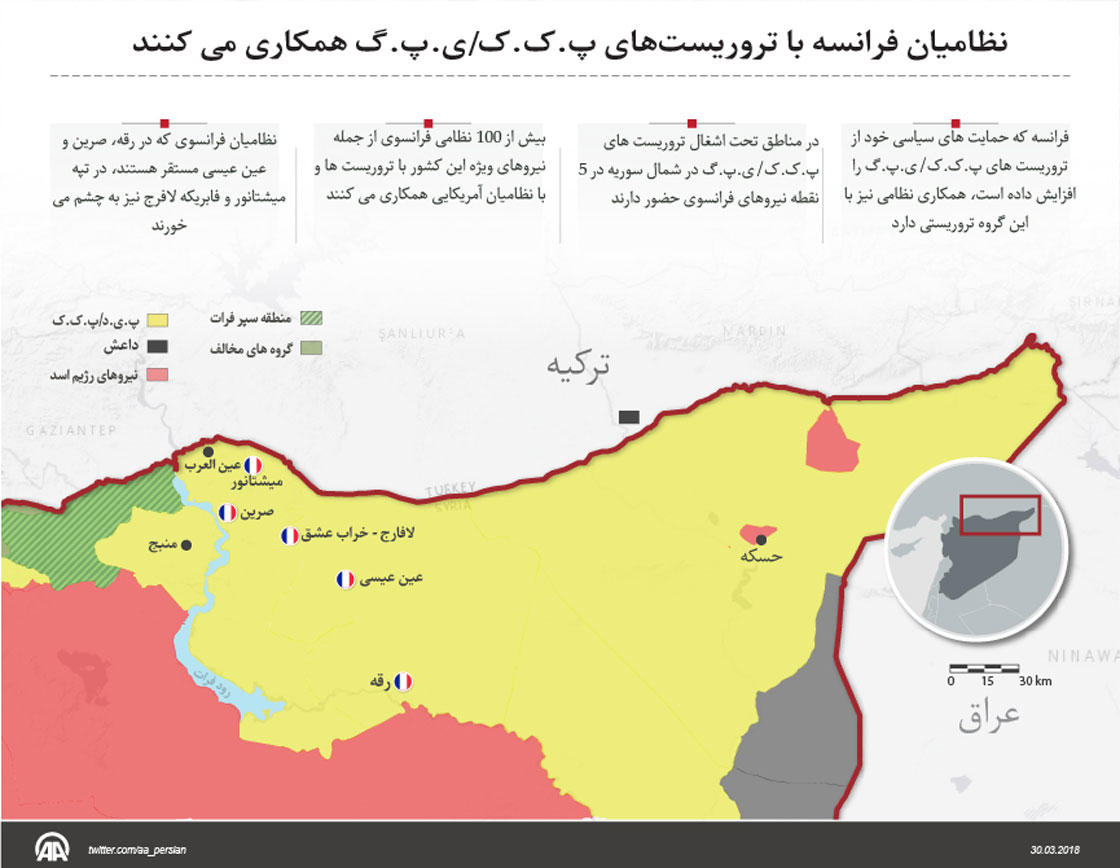 همچنین در رقه نیز بیش از ۳۰ نظامی فرانسوی با گروه تروریستی پ ک ک/ ی پ گ فعالیت می کنند.