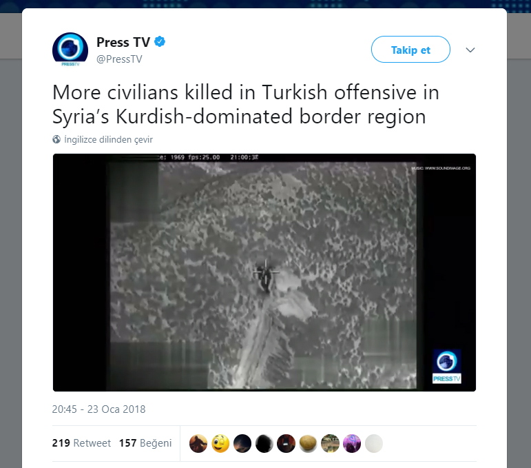 شبکه انگلیسیزبان دولتی ایران موسوم به «پرس تی. وی» طی روزهای اخیر با انتشار تصاویر جعلی و اخبار دروغین و جانبدارانه به سیاه نمایی نسبت به عملیات شاخه زیتون ارتش تورکیه علیه گروههای تروریستی پ.ی.د/پ.ک.ک و داعش در عفرین پرداخته است.