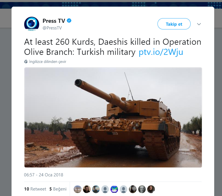 ارتش تورکیه در تاریخ ۲۳ ژانویه اعلام کرد که در چارچوب عملیات شاخه زیتون، تاکنون ۲۶۰ تن از عناصر گروههای تروریستی پ.ک.ک/ک.ج.ک/پ.ی.د-ی.پ.گ و داعش کشتهشدهاند؛ اما پرستیوی آن را بدین صورت «At least 260 Kurds, Daeshis killed in Operation Olive Branch: Turkish military» ترجمه کرده است.