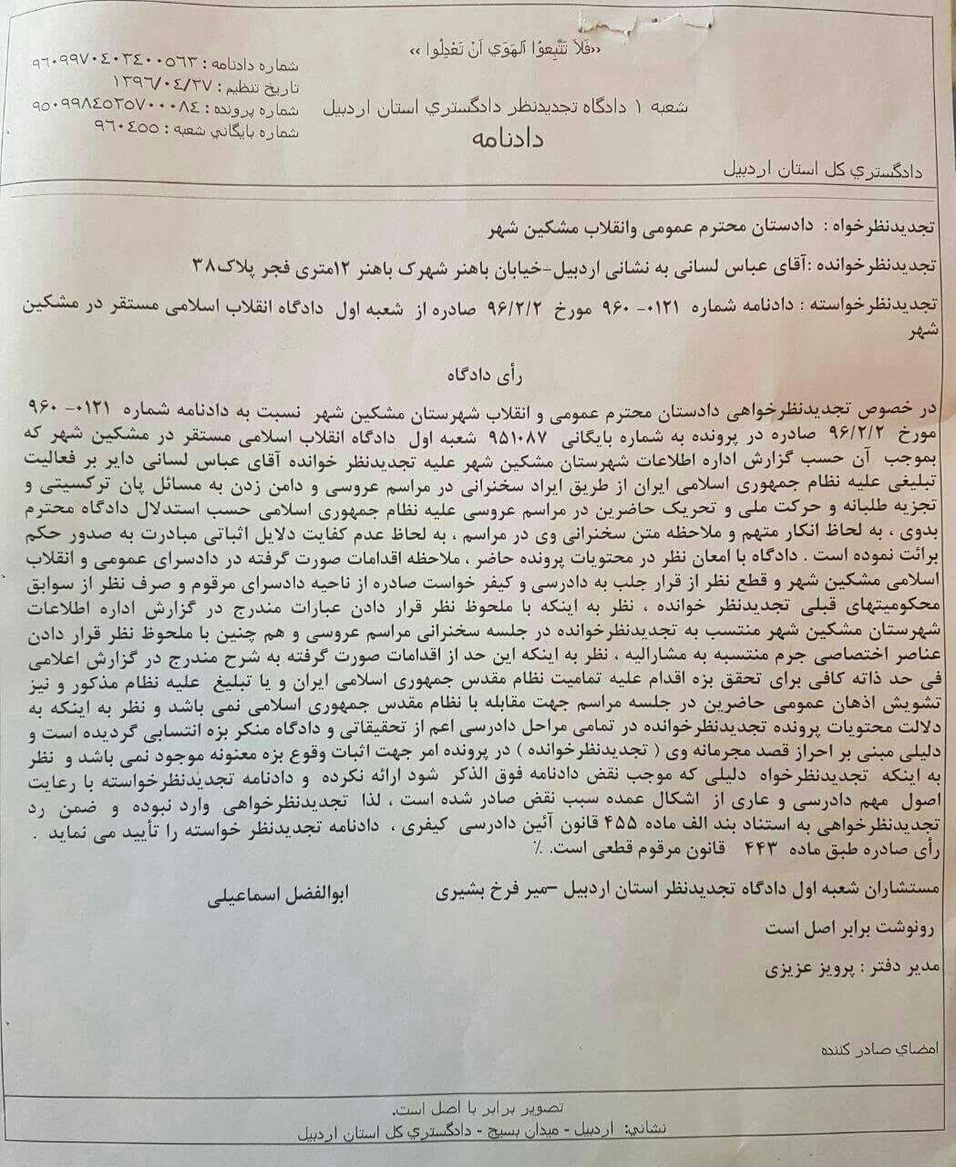 شعبه ۱ دادگاه تجدید نظر دادگستری استان اردبیل حکم بر برائت ایشان صادر کرده است.