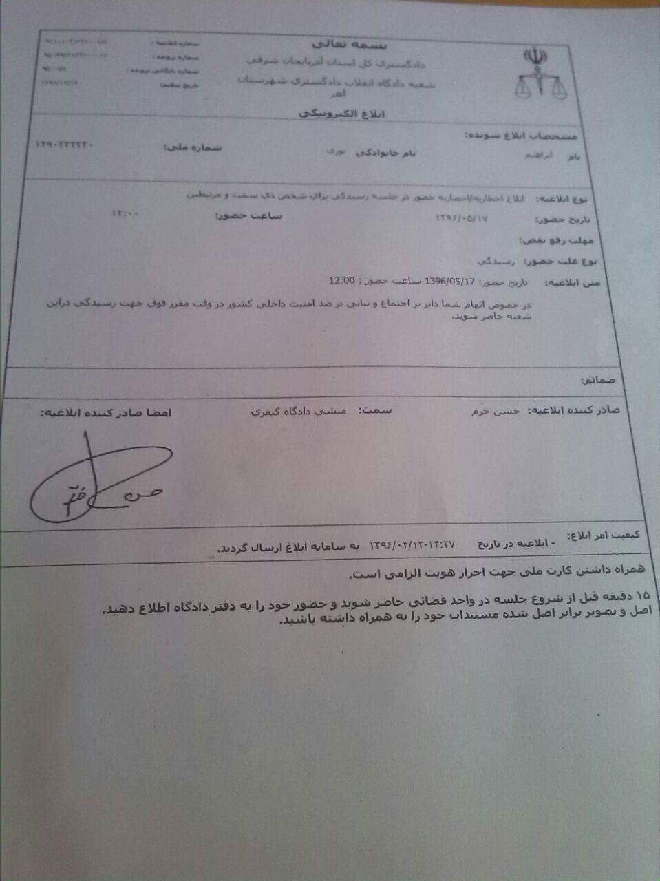 ابراهیم نوری جهت محاکمه برای دو پرونده به دادگاه انقلاب اهر احضار شد