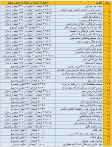 بنا به این متن، بودجه امسال نهادهای غیردولتی که دارای ردیف بودجه دولتی می باشند و میزان ارقام مندرج در جدول به میلیون ریال بوده است به قرار است: