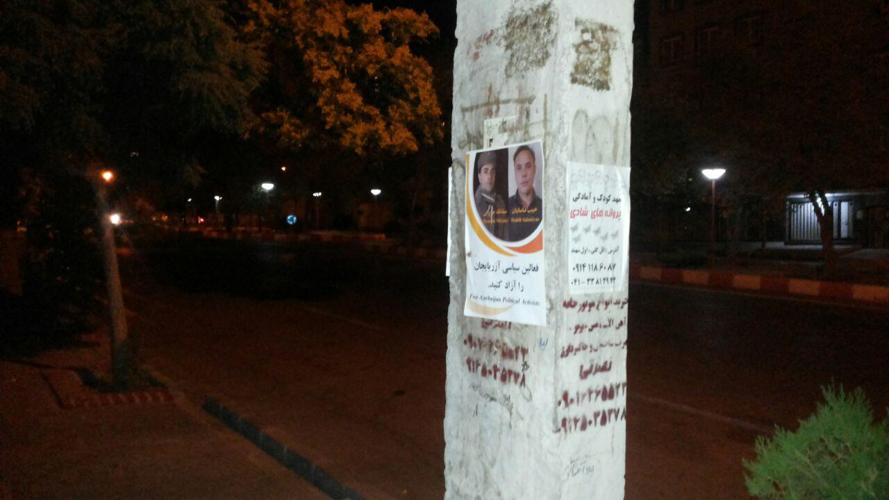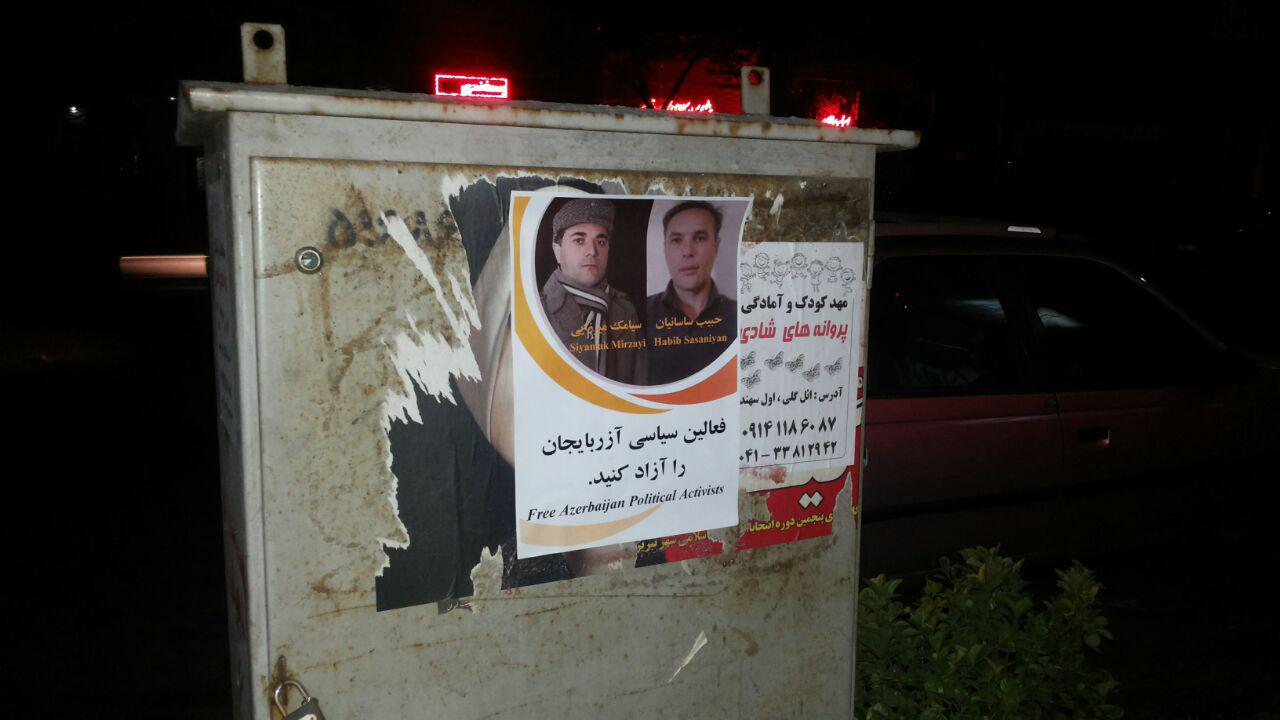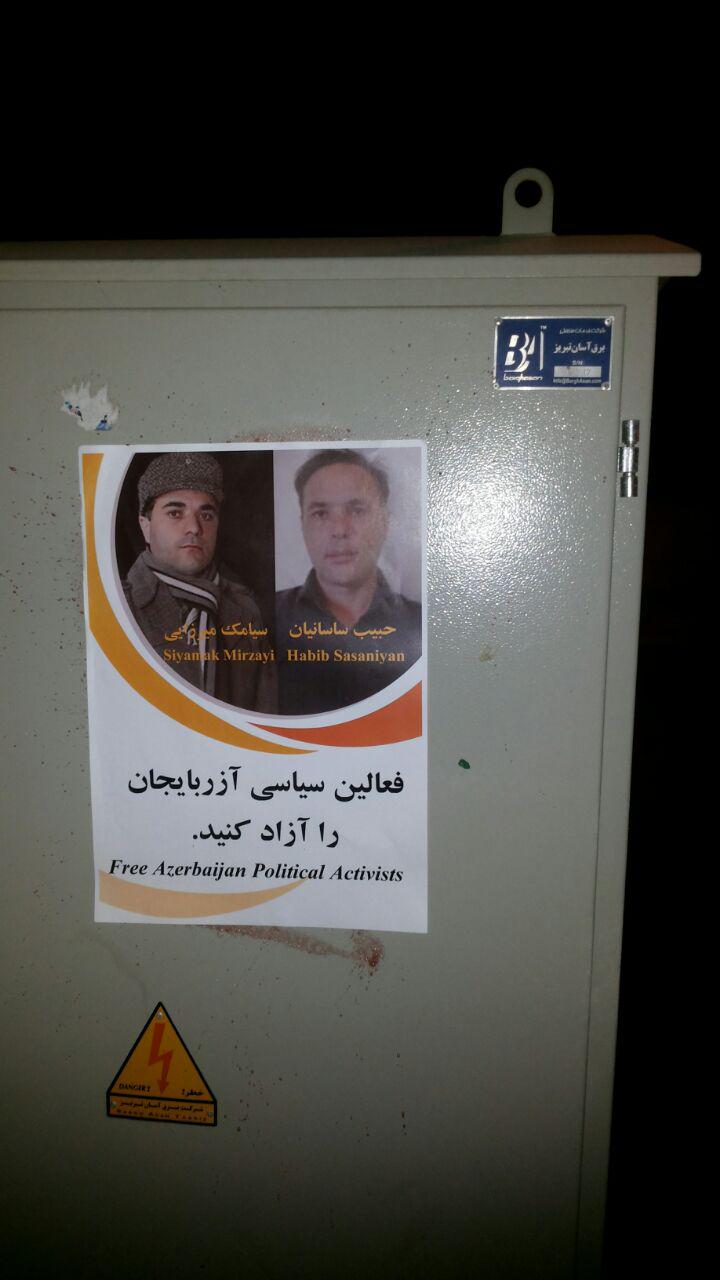 فعالین مدنی آزربایجان با نصب پوستر زندانیان سیاسی آزربایجانی خواهان آزادی بی قید و شرط زندانیان سیاسی آزربایجانی شدند. در این پوسترها تصویر دو تن از زندانیان سیاسی آزربایجان حبیب ساسانیان و سیامک میرزایی نقش بسته و روی آن نوشته فعالین آزربایجانی را آزاد کنید.