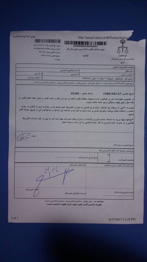 طبق این احضاریه که به منزل شخصی وی در اهر ارسال گردیده باید روز سه شنبه ۱۷ مردادماه ۹۶ در دادگاه انقلاب شهرستان اهر حاضر شود.