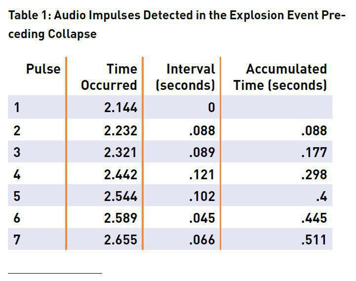 در هنگام ریختن ساختمان نیز انفجارهایی رخ میدهد و در اثر آنها گرد و غبار از دیوارهها به بیرون پاشیده میشود. میتوان این انفجارها را ناشی از افزایش لحظهای فشار هوا دانست. اگر انفجارها ناشی از فشار هوا باشند انتظار میرود تا این انفجارها از طبقات بالا شروع شوند و به سمت پایین حرکت کنند. همچنین نباید دو انفجار در یک طبقه رخ بدهد. اما بررسی فیلم انفجارها چنین چیزی را نشان نمیدهد و در طبقات یکسان با فاصله زمانی انفجارهایی رخ داده و انفجارها نظم گفته شده را ندارند. نحوه آوار شدن ساختمان به گونهای بود که در تخریبهای کنترل شده رخ میدهد. در حقیقت هنگامی که تخریب با مواد منفجره باشد، ساختمان به این صورت فرو میریزد.