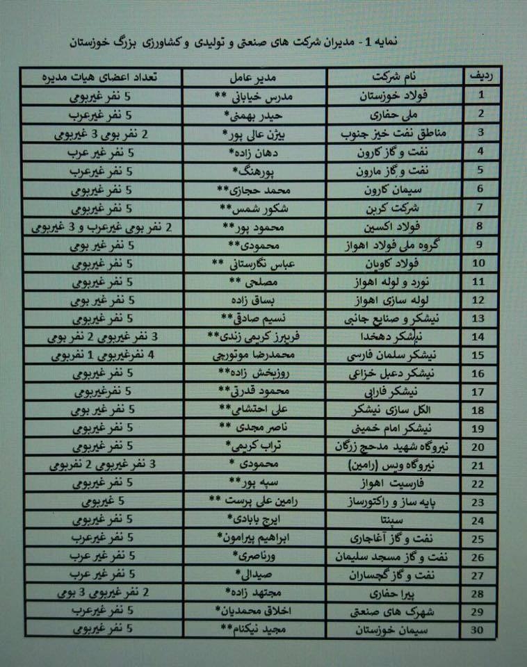 *ملاحظه۱* : دو ستاره نشانه مدیران غیربومی و یک ستاره مدیران لر و بختیاری و بدون ستاره سایر قومیت ها .عبارت غیر عرب برای اعضای هیات مدیره ها یعنی بومی غیرعرب می باشد.