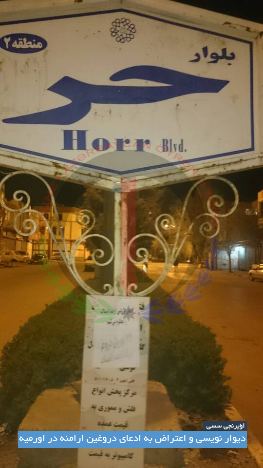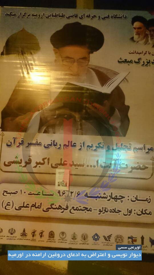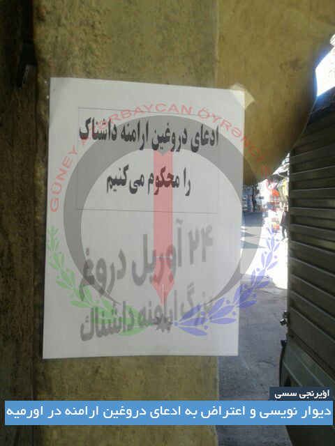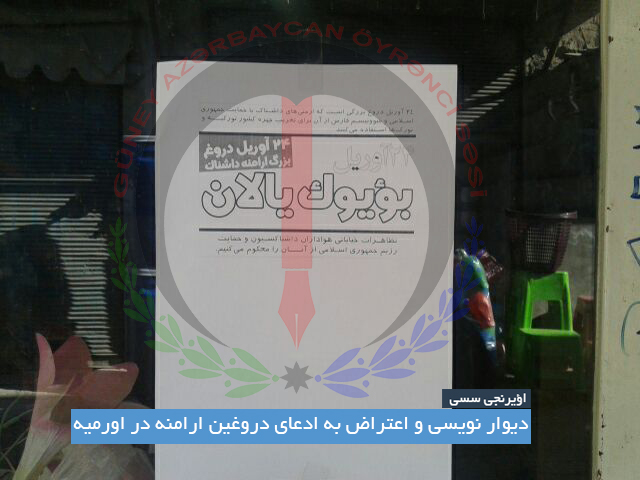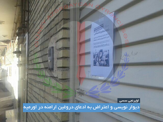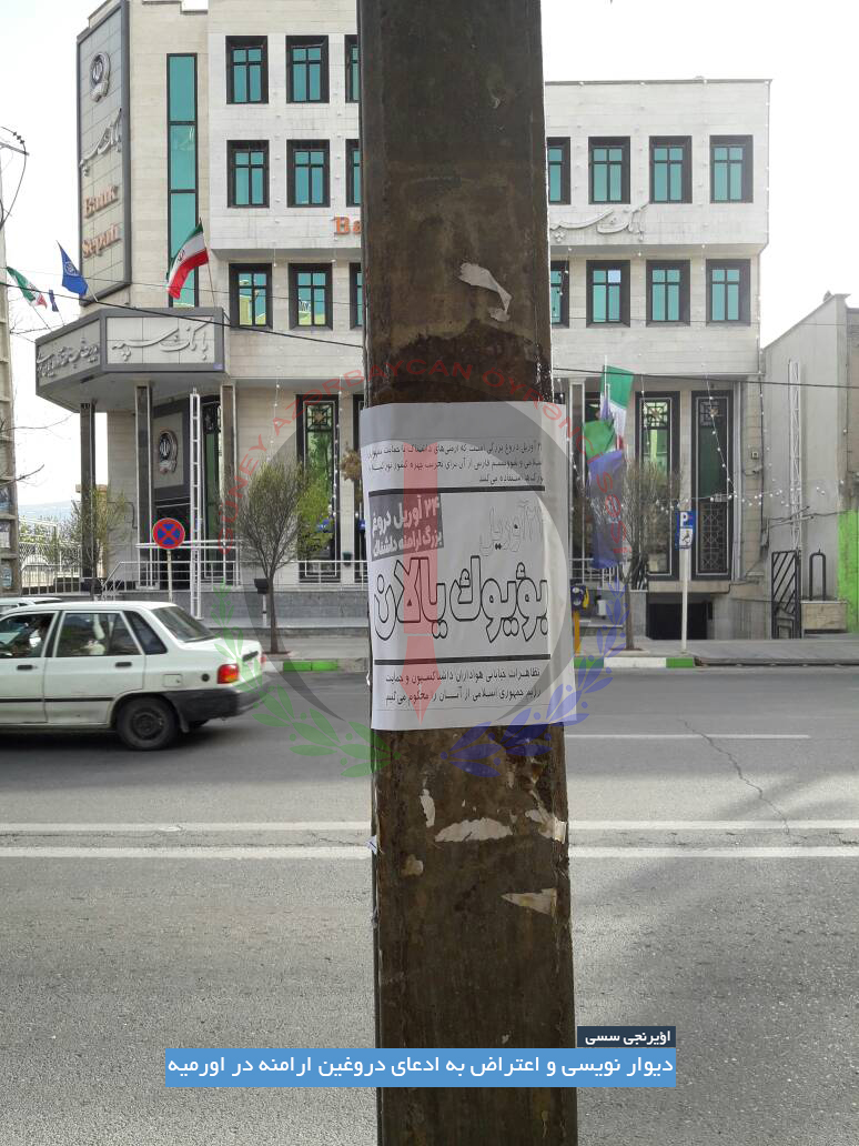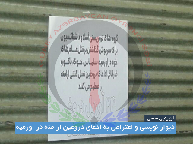 به گزرش وب سایت اؤیرنجی سسی فعالین حرکت ملی آزربایجان و مردم شهر اورمیه با دیوار نویسی و نصب پوسترهایی اعتراض خود نسبت به ادعای دروغین نسل کشی ارامنه و حمایت های جمهوری اسلامی از گروه تروریستی داشناکسیون و ارمنستان را ابراز کردند.