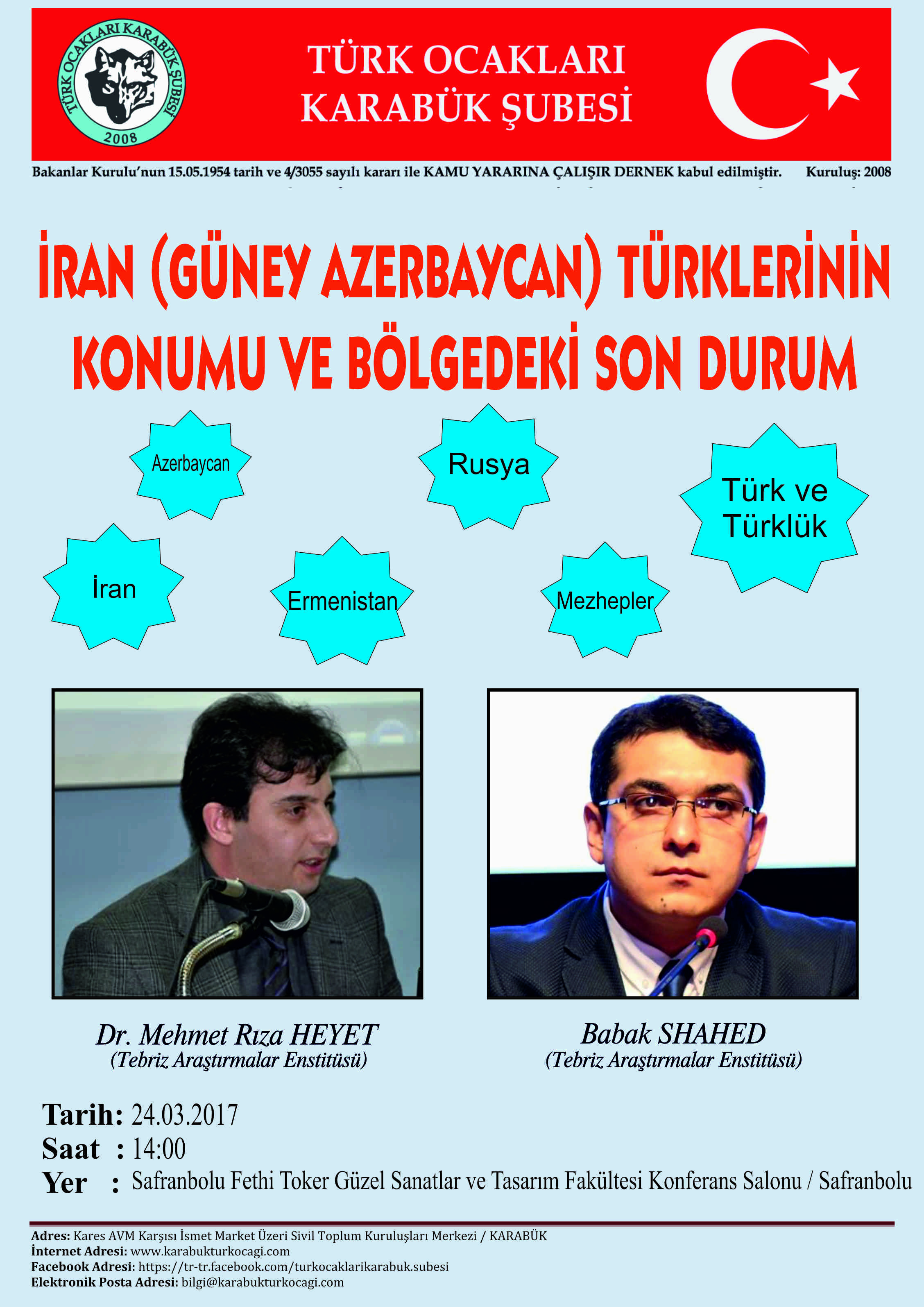 جمعه 4 فروردین 1396 هجری شمسی کنفرانسی با موضوع تورکان آزربایجان جنوبی و ایران در شهر کارابوک تورکیه برگزار خواهد شد.