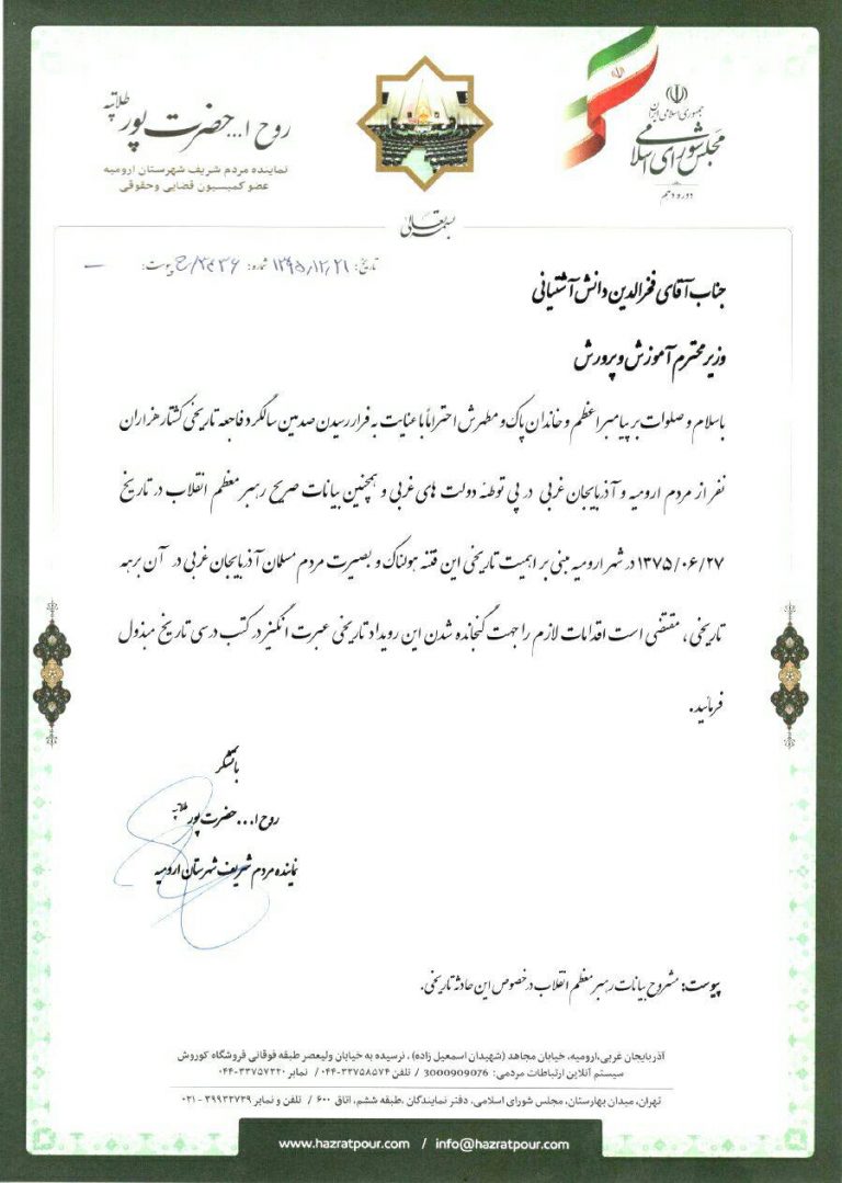 روحا… حضرتپور نماینده مردم اورمیه در مجلس خوهان ثبت نسل کشی تورکهای آزربایجان به بدست جیلوها در کتب درسی شد.