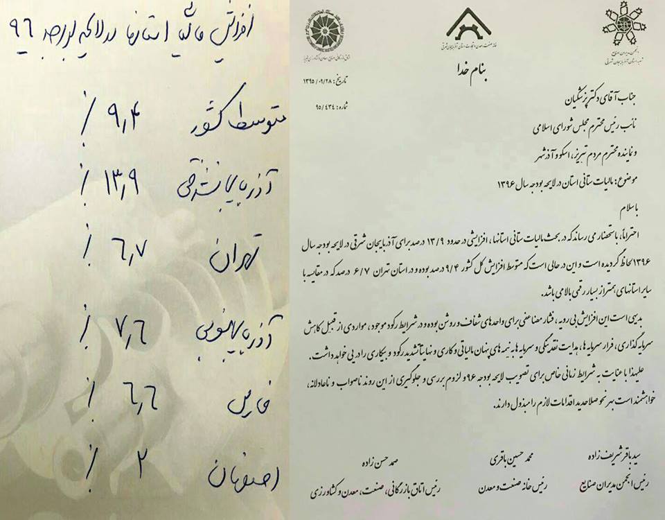 افزایش مالیاتی در کل کشور برای بودجه سال 96 و برای تمام استان ها به طور متوسط ۹٫۴ درصد است که این رقم برای آزربایجان شرقی ۱۳٫۹ درصد و حدود ۶۰ درصد از متوسط کشوری بالاتر است.